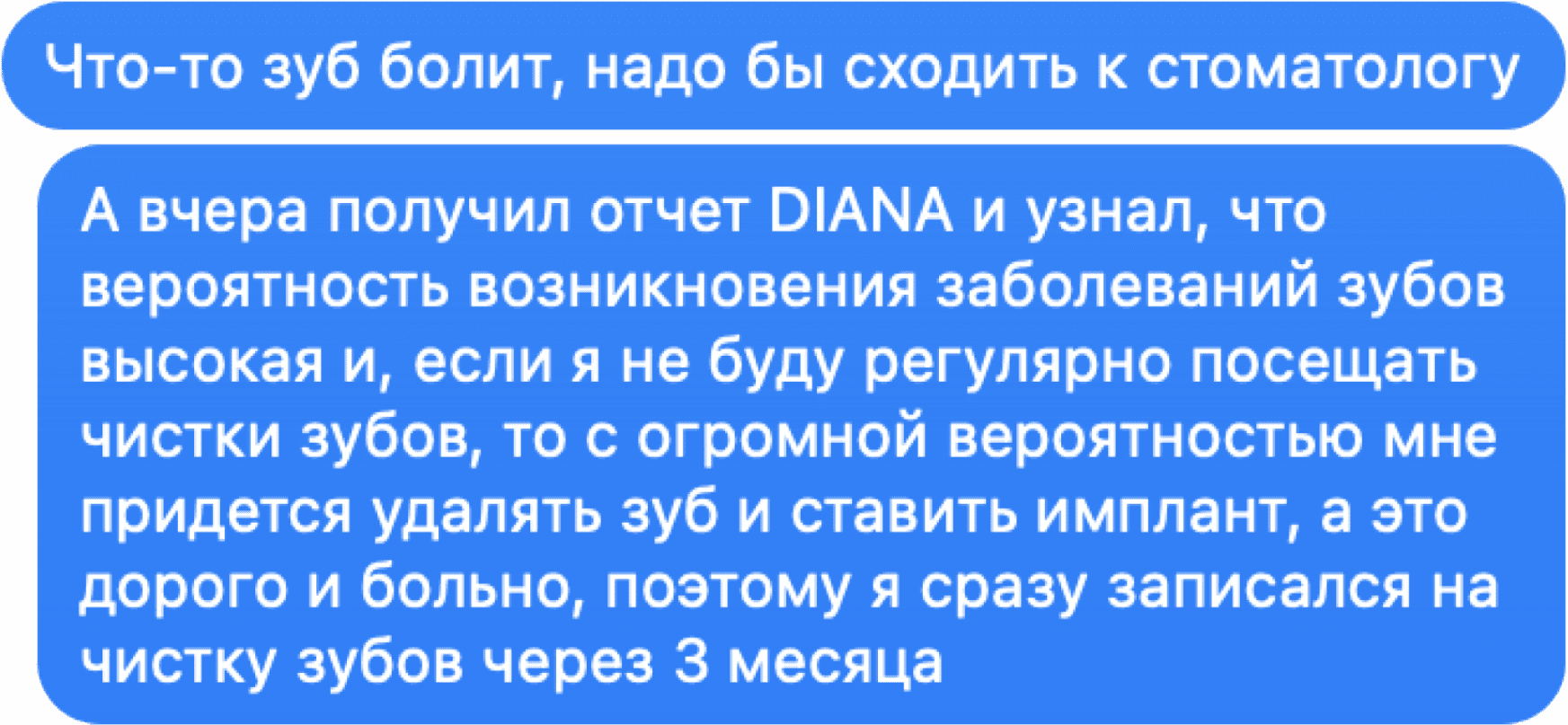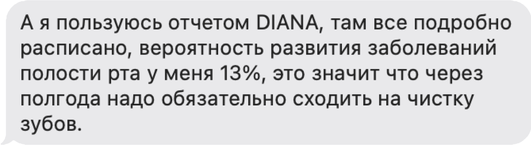 Зная и отслеживая вероятность возникновения заболевания, можно заблаговременно предупредить пациента и предложить ему записаться на осмотр. Благодаря использованию отчета DIANA на приеме число повторных посещений вырастает на 50%.