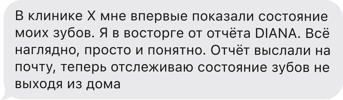В результате внедрения программы DIANA пациенты чаще возвращаются в клинику и рекомендуют сделать отчет своей семье и друзьям. По результатам 25 клиник-партнеров через 5 месяцев после внедрения программы прибыль клиники в среднем возрастает на 50%.